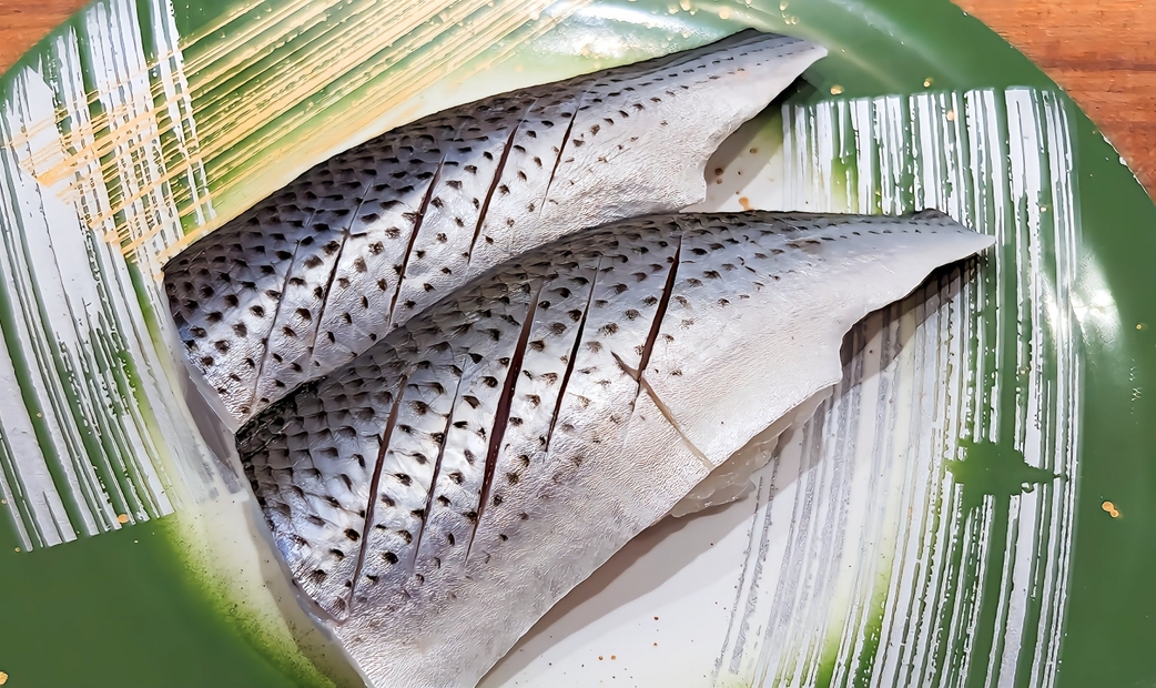 Kohada has a beautiful silvery appearance, but decorative knife work is applied to make it look even better. Particularly in recent years, as visual presentation has become more important, more restaurants have begun applying decorative knife work. Making cuts with a knife to make the fish easier to eat is called "hidden knife work" (kakushi-bōchō).