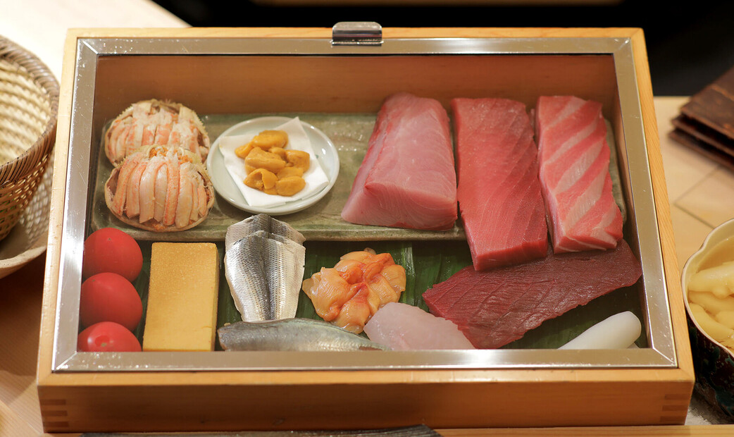 After 15 years of training at Kyubey, Mr. Tsutomu Oba, who became independent, is the owner of this establishment. Unlike the main branch of Kyubey, he prepares sushi with red vinegar rice. Mr. Oba himself holds a sommelier qualification, making it easy to consult about wine.