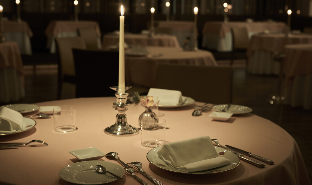 The interior consists of a main dining area and three private rooms. The dining area features a soaring 6-meter-high ceiling with an exquisite original chandelier inspired by lamps, gracefully shimmering and creating an elegant atmosphere. A striking spiral staircase adds to the charm, inviting guests into an extraordinary experience.