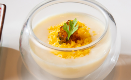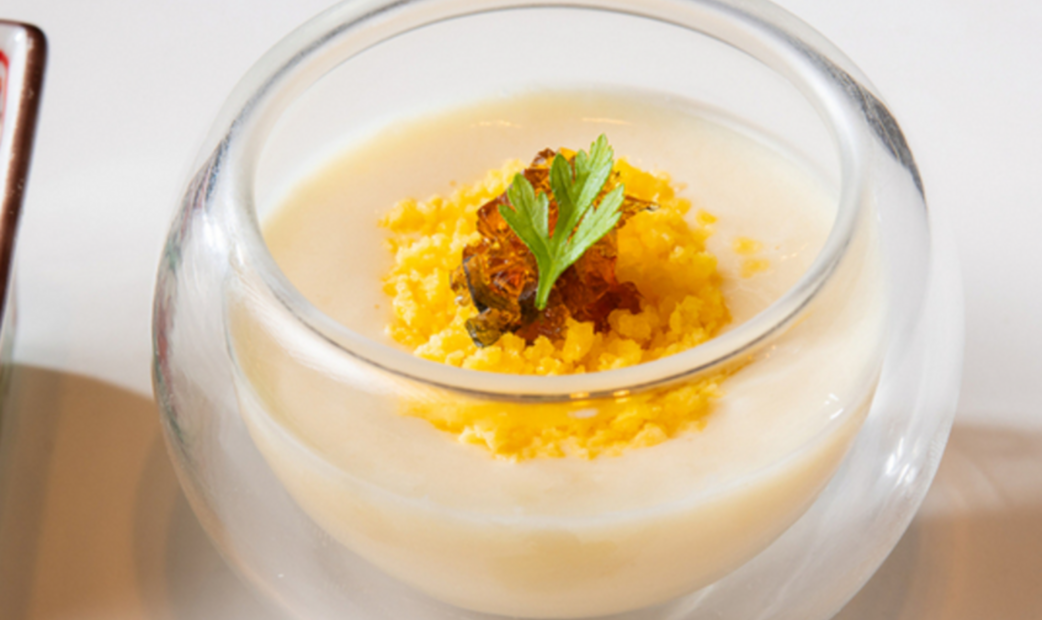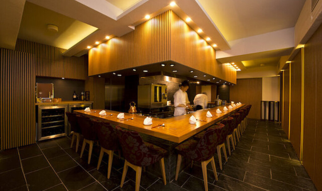 Inside, the 12-seat U-shaped counter surrounds an open kitchen, where guests can enjoy the lively atmosphere of watching dishes being prepared right before their eyes, stimulating all five senses.