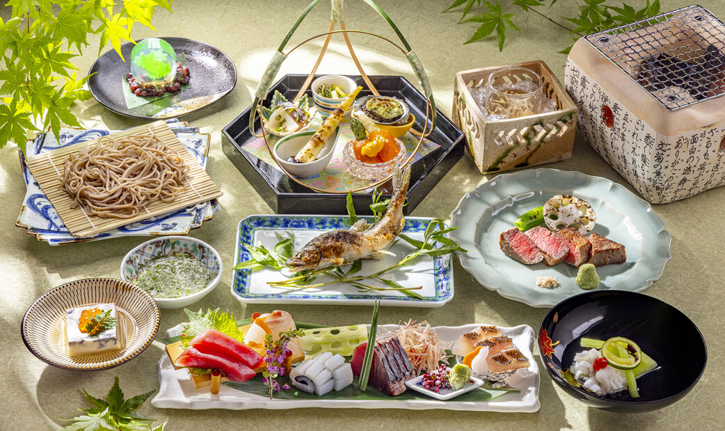 In a traditional sukiya-style setting with spectacular views of a lush Japanese garden, enjoy a seasonal kaiseki (a traditional Japanese multi-course meal) showcasing fresh ingredients paired with premium sake from across Japan.