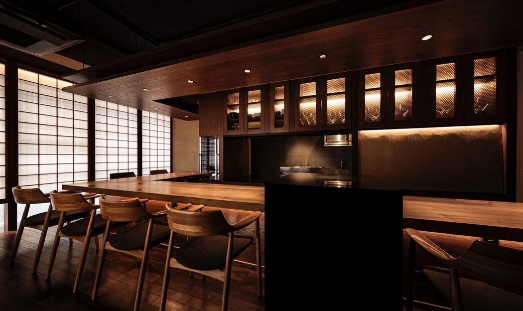 The restaurant is an intimate space with only nine seats at the counter. Quietly located on the first floor of a building facing Taisho Street, guests can enjoy a serene and sophisticated dining experience in a tranquil setting. Especially at night, the interplay of soft lighting and artfully plated dishes creates a truly special moment.