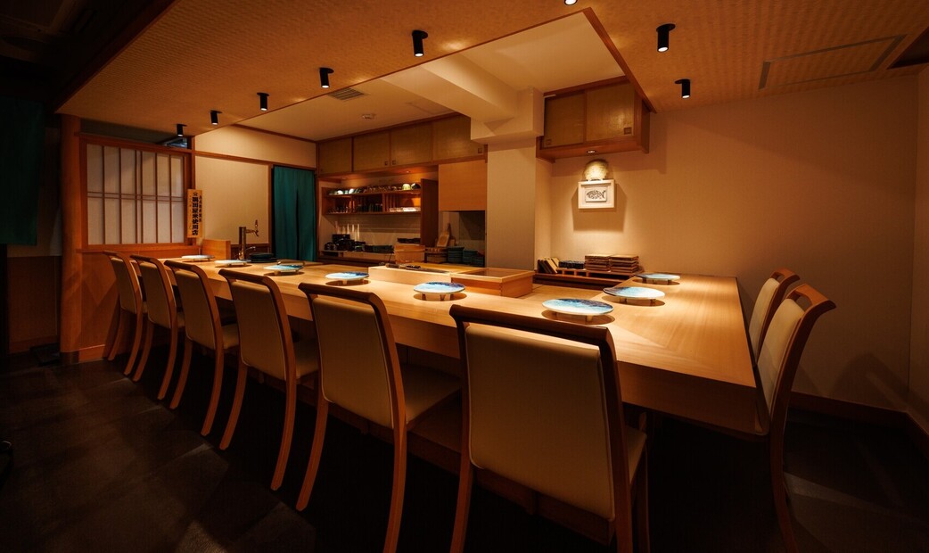 在高品质的桧木吧台座位上,看着以海洋为主题的客制化餐具,享受厨师精巧的手艺。