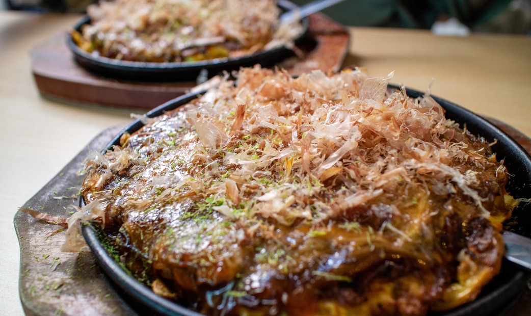 將生菜和豬肉等材料加入面粉中烤制,最後淋上醬汁的經典美食。道頓堀區域有眾多大阪燒店,其中「味乃屋」、「美津的」等較為知名。