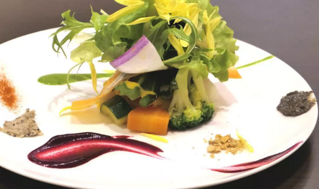 我們使用大量蔬菜來表現京都的地方文化,例如我們的招牌沙拉有 30 種蔬菜,將一種食材以多種形式呈現的“déclinaison”料理,展現食材的品質和廚師的精湛技藝。