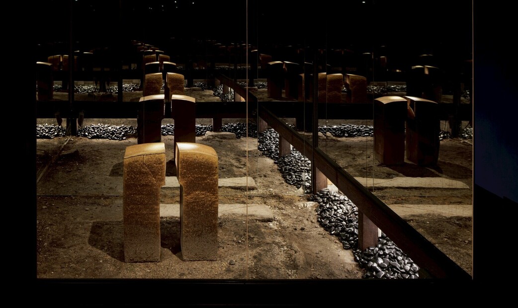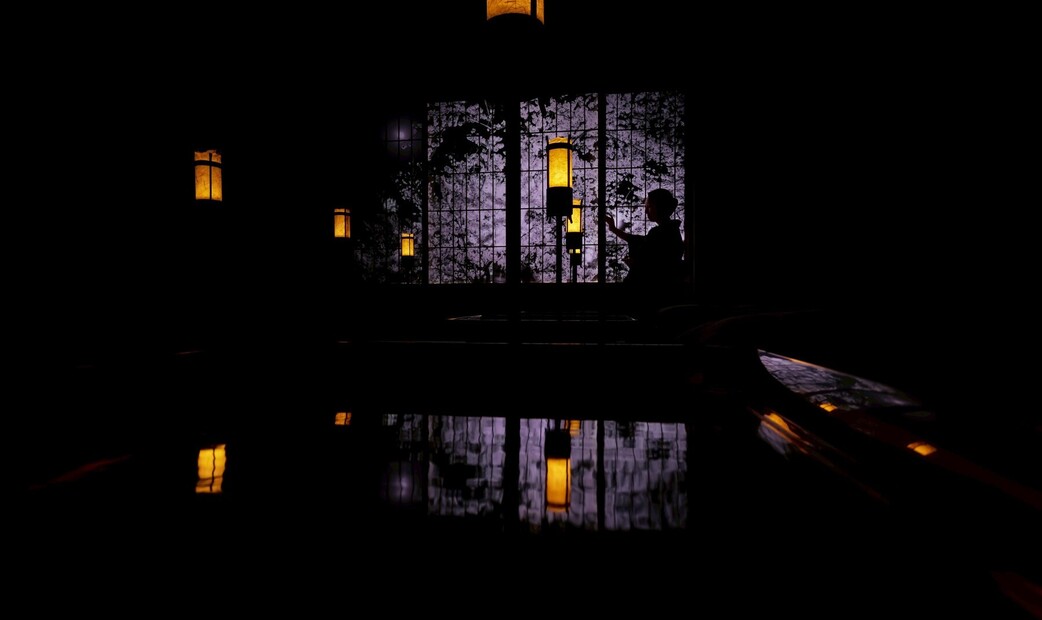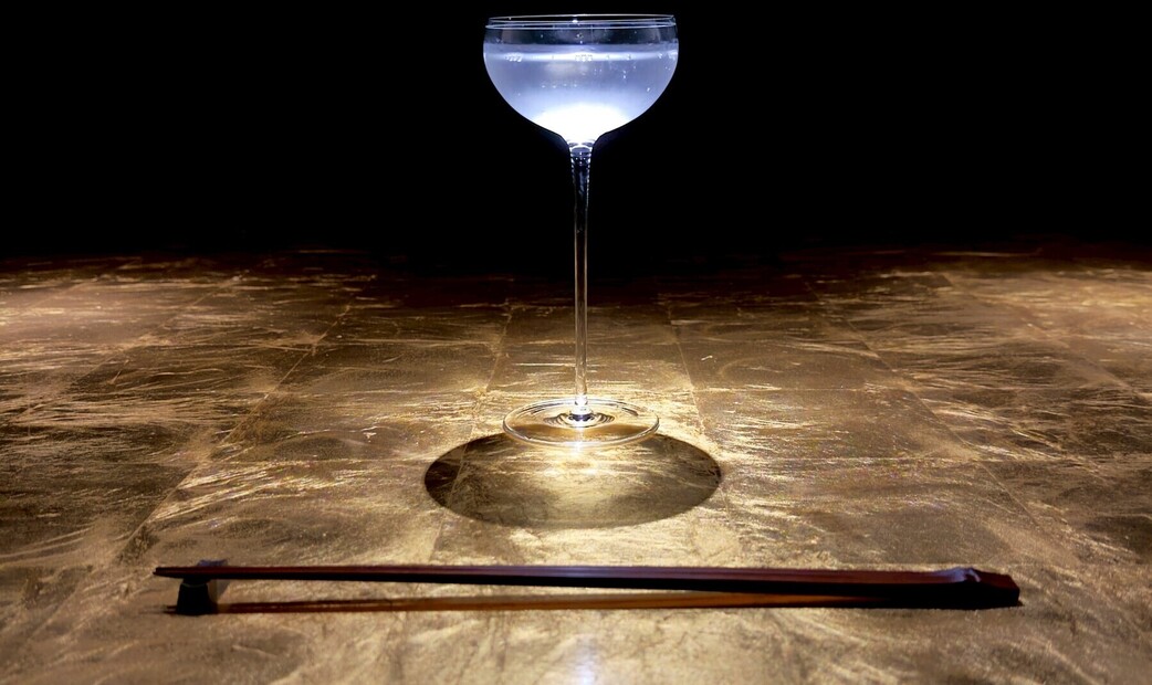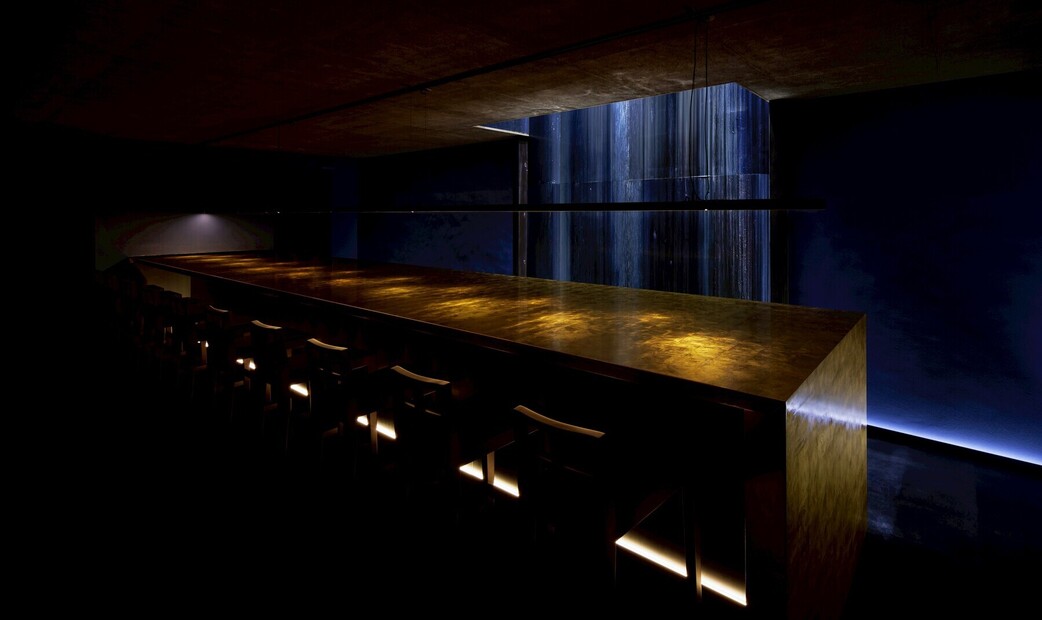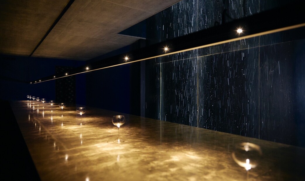 純金箔的櫃檯映照著淡淡的光芒,小雨包圍著店內,彷彿時間在靜謐中滲透,您可以在此享受日本酒和料理。